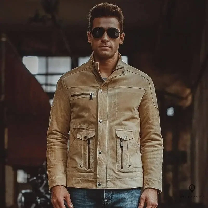 Un look moderne et clair parfait pour la mi-saison ! Ce blouson pour homme en cuir suédé blanc dispose de plusieurs poches. Vous avez une poche zippée au niveau de la poitrine puis deux poches latérales deux-en-un. En effet, vous avez deux poches ouvertes avec en plus deux petites poches zippées. Le col style biker peut aussi se rabattre si vous voulez un autre style. C’est là toute la polyvalence de cette tenue , qui n’a pas fini de vous surprendre, croyez-nous bien ! Le confort avant tout Ce qu’il y’a de bien avec cette veste, c’est qu’elle vous apportera un confort exceptionnel . Elle est faite pour les températures de mi-saison, que cela soit pour le printemps ou encore pour l’automne, mais on pourra aussi la retrouver l’hiver Elle rappelle un peu le style biker / motard, mais ce bomber faisant office de blouson zippé est typique du style aviateur. Avec une paire de lunettes de soleil aviateur, le tour est joué ! Aviateur Solitaire vous permet d’avoir le look aviateur à portée de main, profitez-en ! Nous vous invitons à vous référer au guide des tailles et de prendre 1 taille au-dessus de la vôtre car le blouson aviateur doit tailler large. Taille du mannequin :